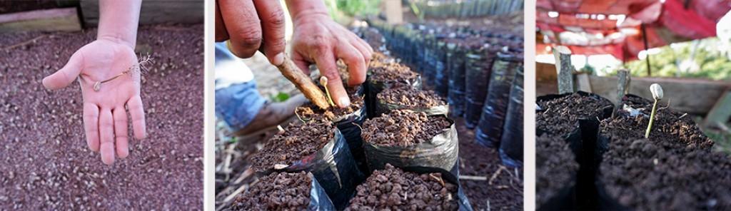Una vez preparadas las bolsas, procedemos a abrir un pequeño hoyo en la mitad del semillero. Debe tener el espacio suficiente para evitar que se doblen las raíces de la semilla, pues podríamos perjudicar el crecimiento del café o, incluso, provocar su muerte. Introducimos las raíces en el semillero y cubrimos con el compost. Procedemos a prensar bien la tierra con un palo ahoyador, ejerciendo una presión controlada y circular alrededor de la semilla hasta que quede bien sujeta. Regamos.